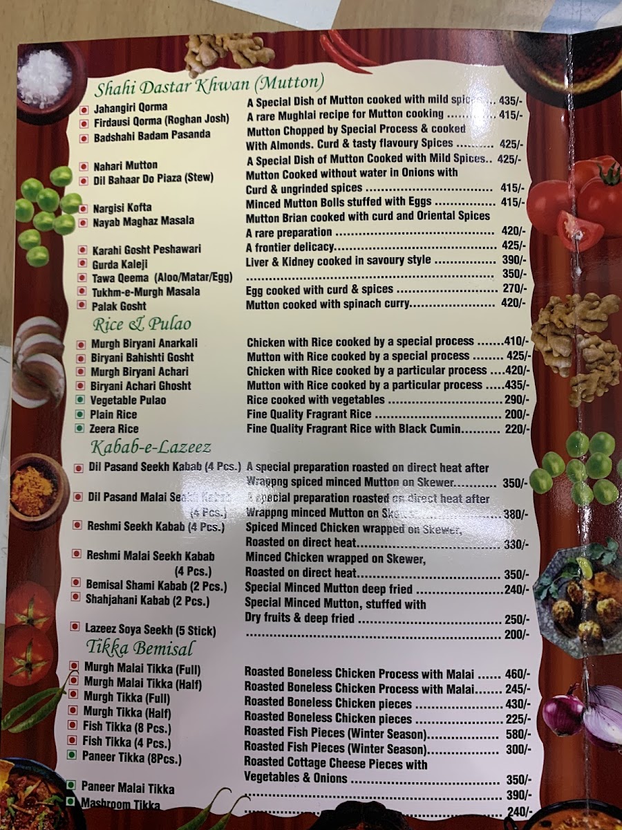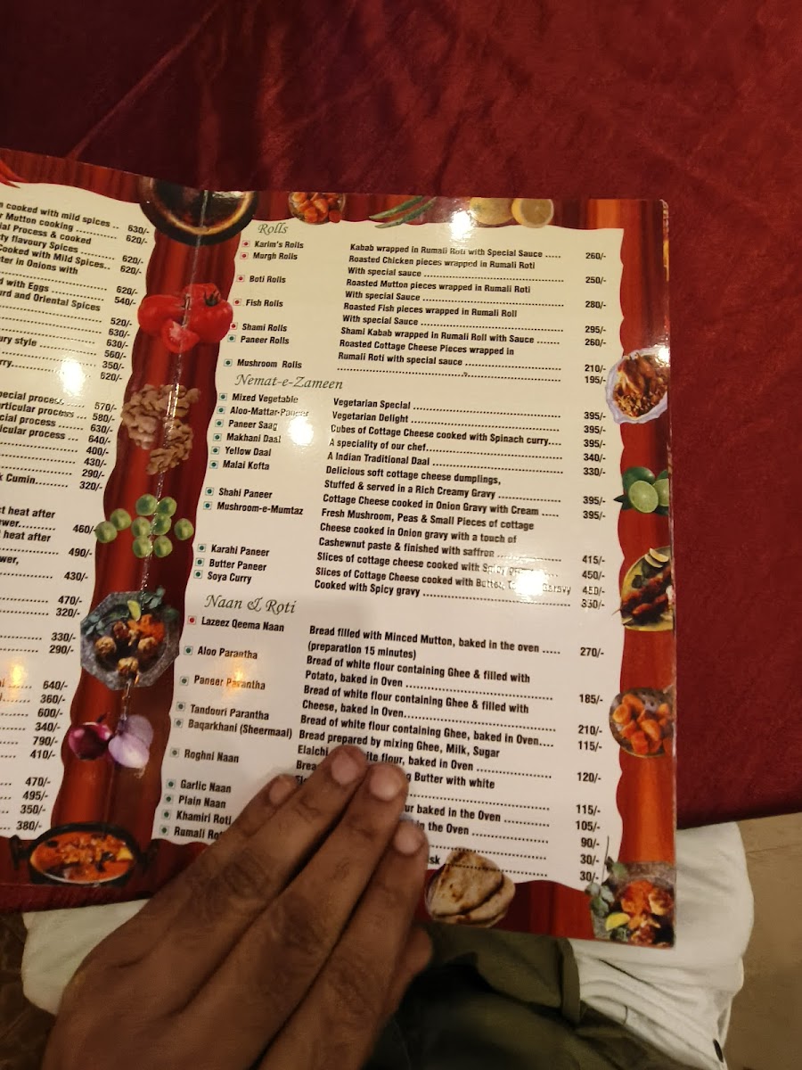 Introducing the menu at Karim's - the best family restaurant in Noida is an experience that awakens the senses. Nestled in Sector 18, this culinary gem offers a blend of royal flavors and authentic recipes. Start with the Shahi Dastar Khwan, a luxurious Murgh Musallam, showcasing chicken stuffed with flavorful rice and dry fruits, all steeped in special spices for ₹1,450. The Akbari Murgh Masala and the Shahi Murgh Do Piaza tell stories of aromatic spices simmered to perfection. For bread lovers, the Lazeez Qeema Naan and mouthwatering Aloo Parantha provide the perfect accompaniment. Finish with a scoop of your favorite ice cream—classic Vanilla or enticing Cassatta. Dining here feels like a nostalgic journey back to Old Delhi, where taste reigns supreme, enveloping you in flavors that linger long after your meal. Visit to indulge your palate and relish the tradition of hearty, flavorful meals.